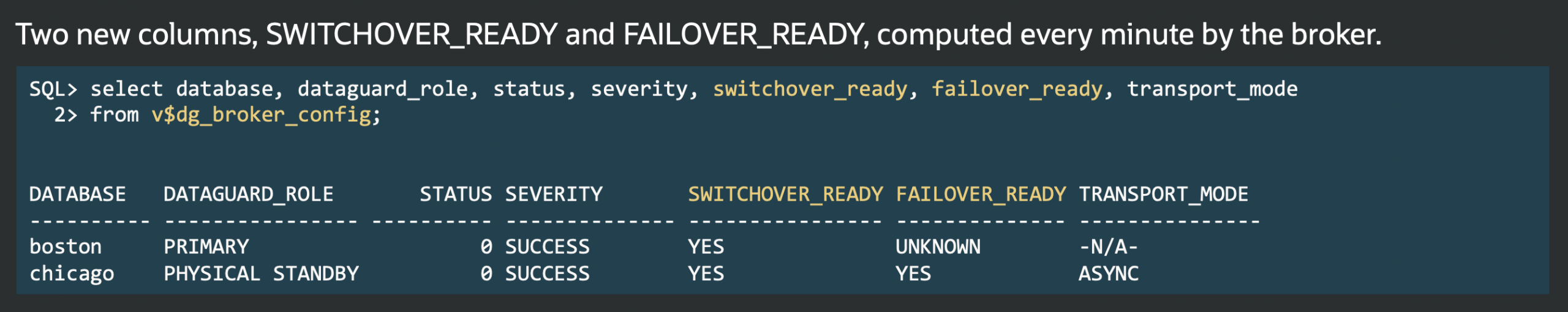 In Data Guard 26ai, the V$DG_BROKER_CONFIG view now includes two new columns: SWITCHOVER_READY and FAILOVER_READY. These columns, updated every minute by the Data Guard Broker’s health check, provide the status for switchover and failover readiness.