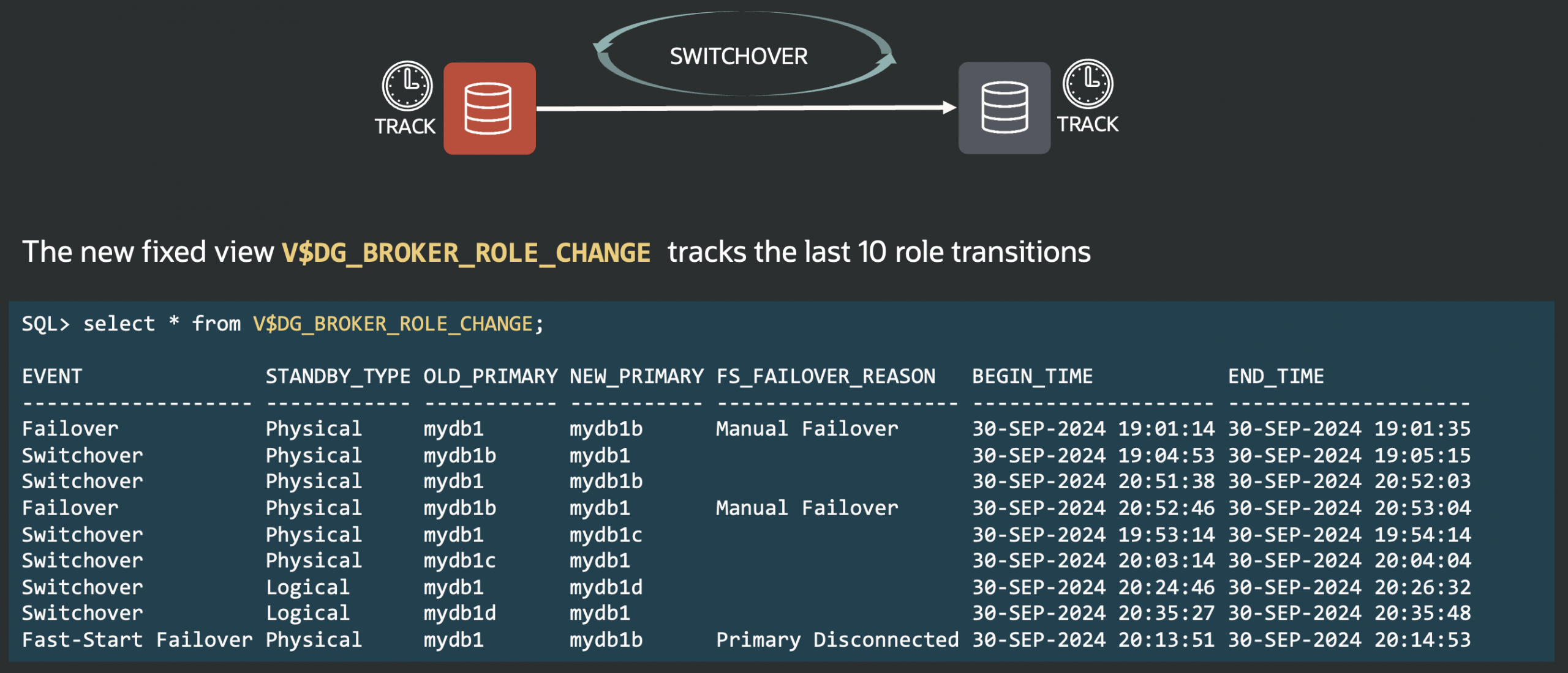 This view makes it easy to see recent role changes without searching through alert logs. It also helps identify what was the primary database at any given moment. The view stores only the ten most recent role changes; to keep a longer history, you can copy its records into a regular table; for example, using a STARTUP trigger on the primary database.