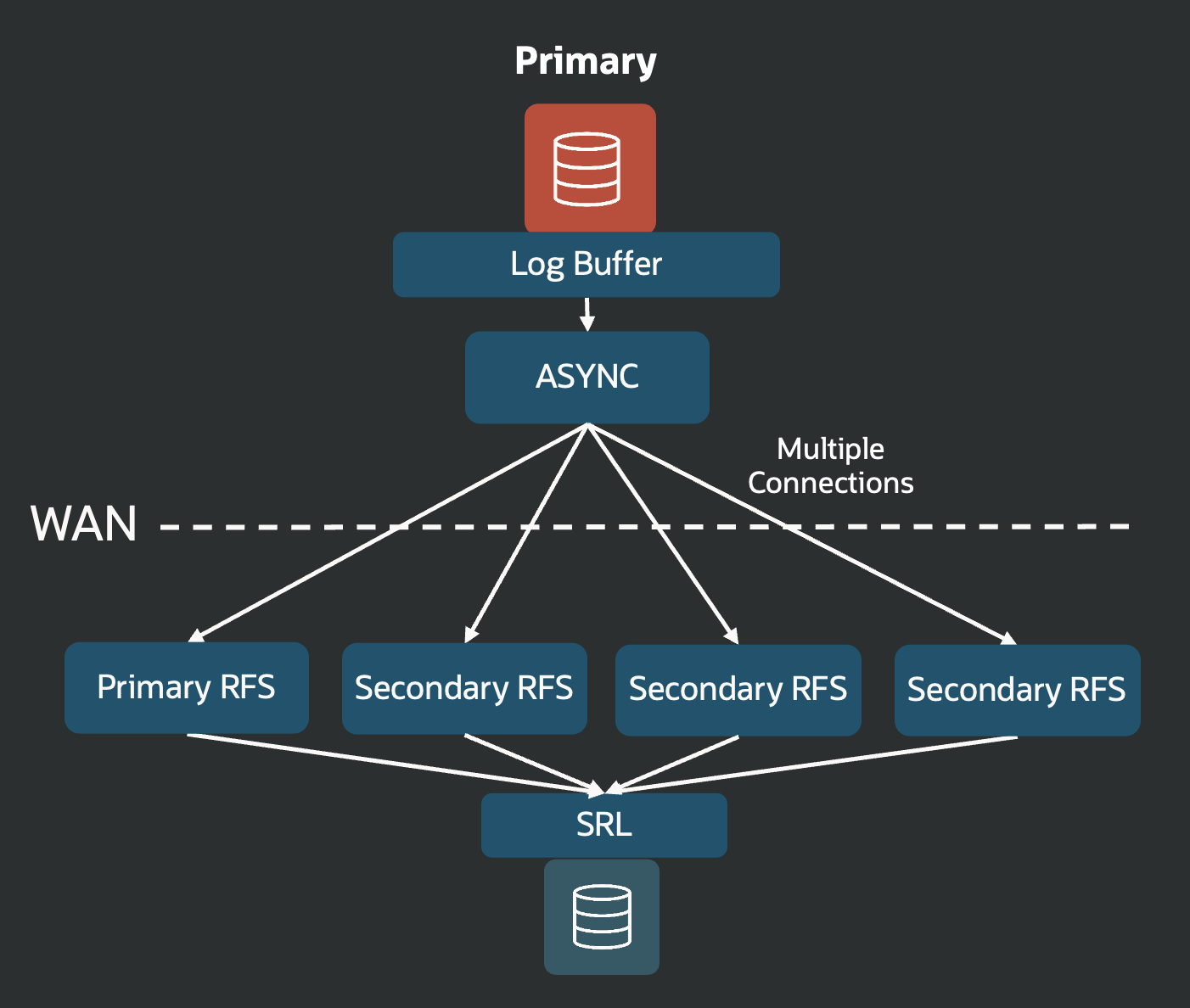 Starting in 26ai, an asynchronous process can notice when a connection is using all its available bandwidth and then open extra connections for better throughput and less lag. This change helps especially in cloud environments, where each connection often has its own bandwidth limit. On the receiving side, there is one RFS process for every connection.