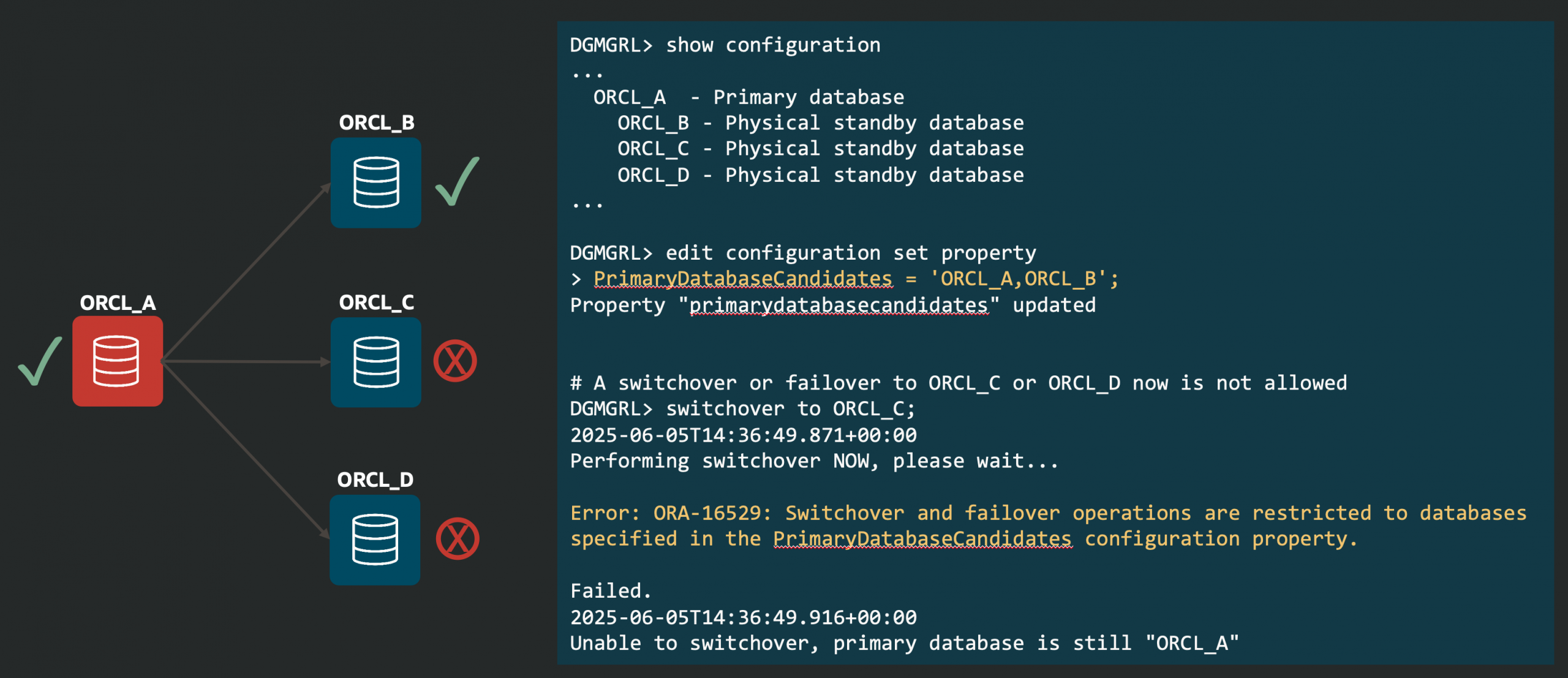 Oracle Database 26ai introduces a new broker property: PrimaryDatabaseCandidates. Set this to specify which databases can become primary. If you try to switch or fail over to a database not on the list, the broker blocks it.